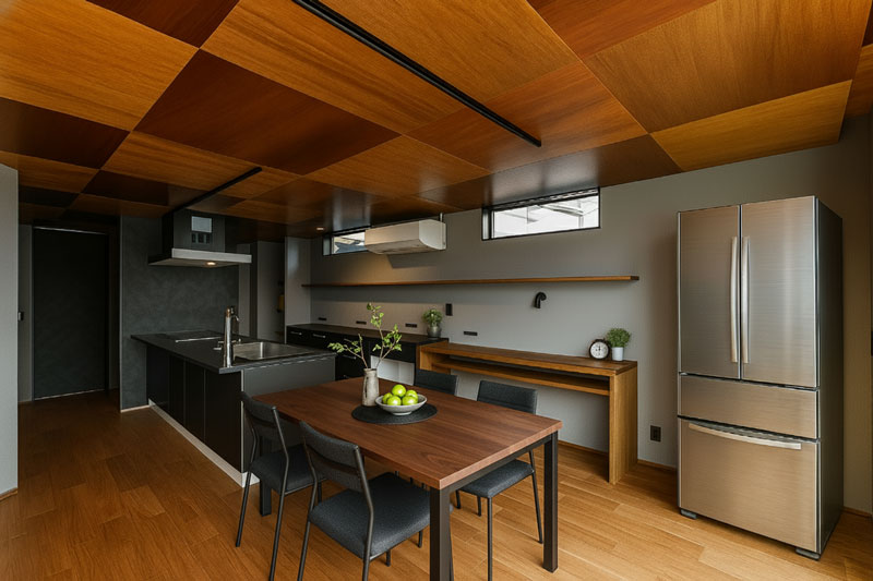 ラワン合板の天井を取り入たLDKは、木の温もりと無機質なキッチンが絶妙に調和。