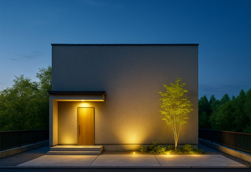 飽きのこないシンプルな外観は、塗り壁の質感と植栽の緑が映えるデザイン。