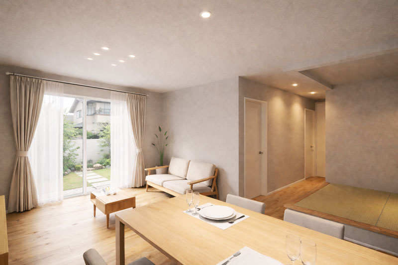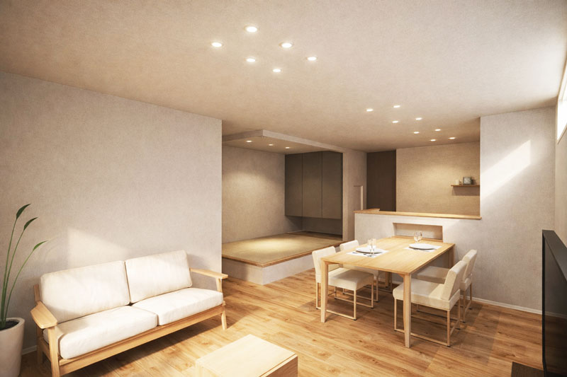 キッチンに立つと、LDK全体を見渡せる設計。料理をしながらお子様の遊ぶ様子や、家族の気配を自然に感じられます。