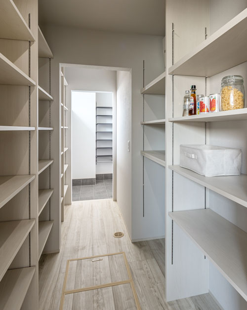 また、玄関の土間収納からパントリーへとつながる動線により、買い物帰りの荷物もスムーズに収納。