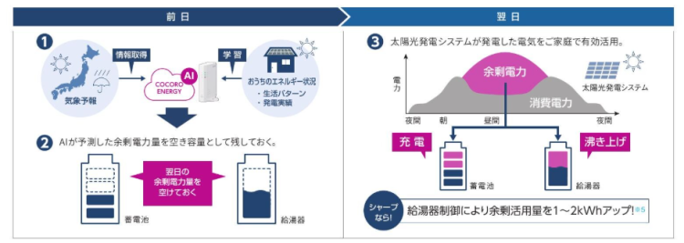 また、天気予報の情報を取り込むことで太陽光パネルの発電量を予測してエコキュートの前日の沸き上げ量を調節することで節電につながります。