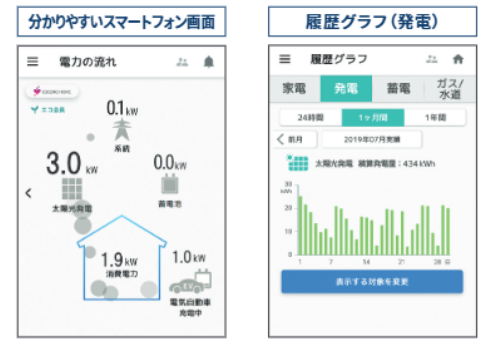 いつでもどこでもスマートフォンで太陽光での発電量や電気少量を確認ができます。