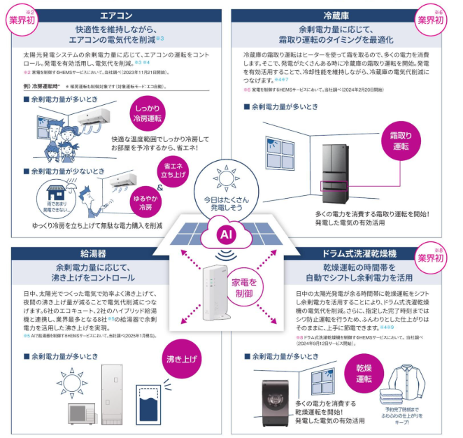 太陽光発電と家電や住設機器が連携することにより、AIが予測した余剰電力量に応じて賢く省エネを行うことができます。