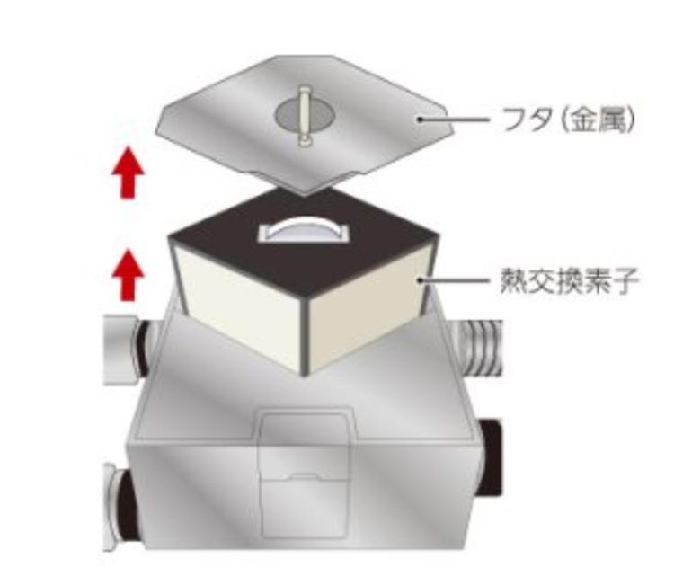 本体上部のふたを開け、中にある熱交換素子を引き出します。その後、熱交換素子やケースの内部のホコリを掃除機で吸い取ってください。