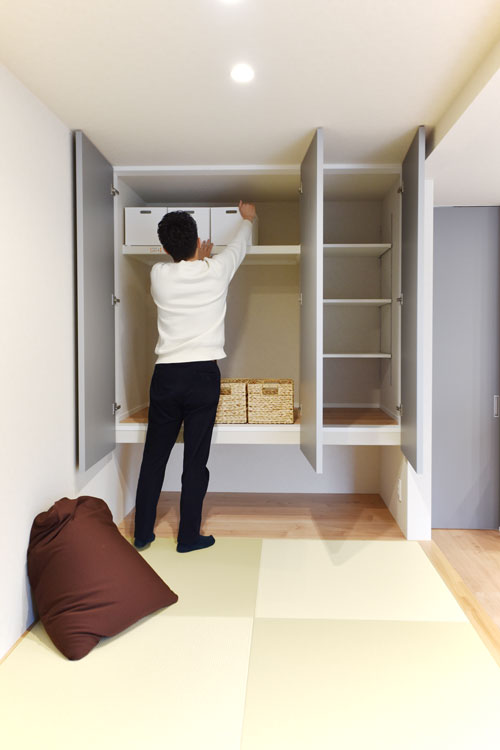 右側の可動棚にはリビングで使う小物や書類を、左側には来客用の布団や季節のアイテムを収納可能。