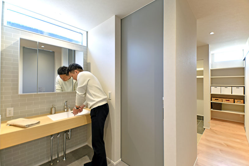 玄関からリビングを通らずに、手洗い・うがいができる「ただいま手洗い動線」。