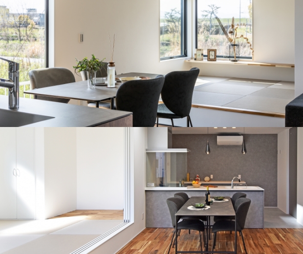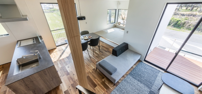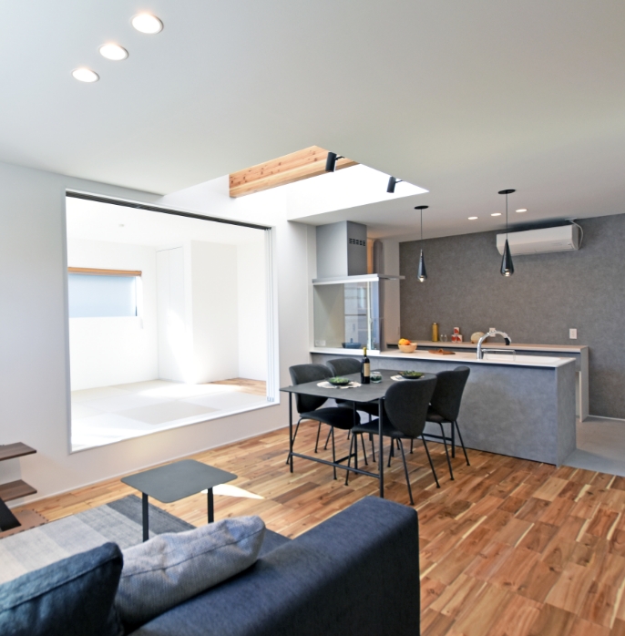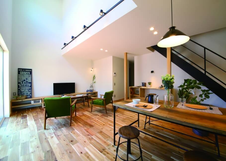 無骨さと温かさが調和した大人ヴィンテージ空間。吹き抜けと鉄骨階段が開放感を演出し、家族の心地よい時間を育みます。成長に合わせて変化する和室が、暮らしに寄り添うプラスワンルームとして活躍します。