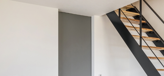 お客様を迎えることの多い1階のドアは、天井まで続くハイドアを使用。空間がつながり、広々と感じる部屋を作ります。