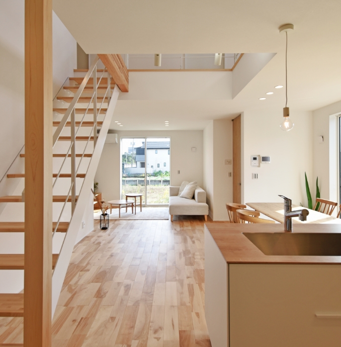 LDKと庭を見渡せる対面キッチンで、家族を見守りながら家事を楽しめます。吹き抜けと白い鉄骨階段が明るく開放的なリビングを演出し、自然と会話が生まれる空間に。 メンテナンス性も兼ね備えた美しい塗り壁の外観が特徴です。