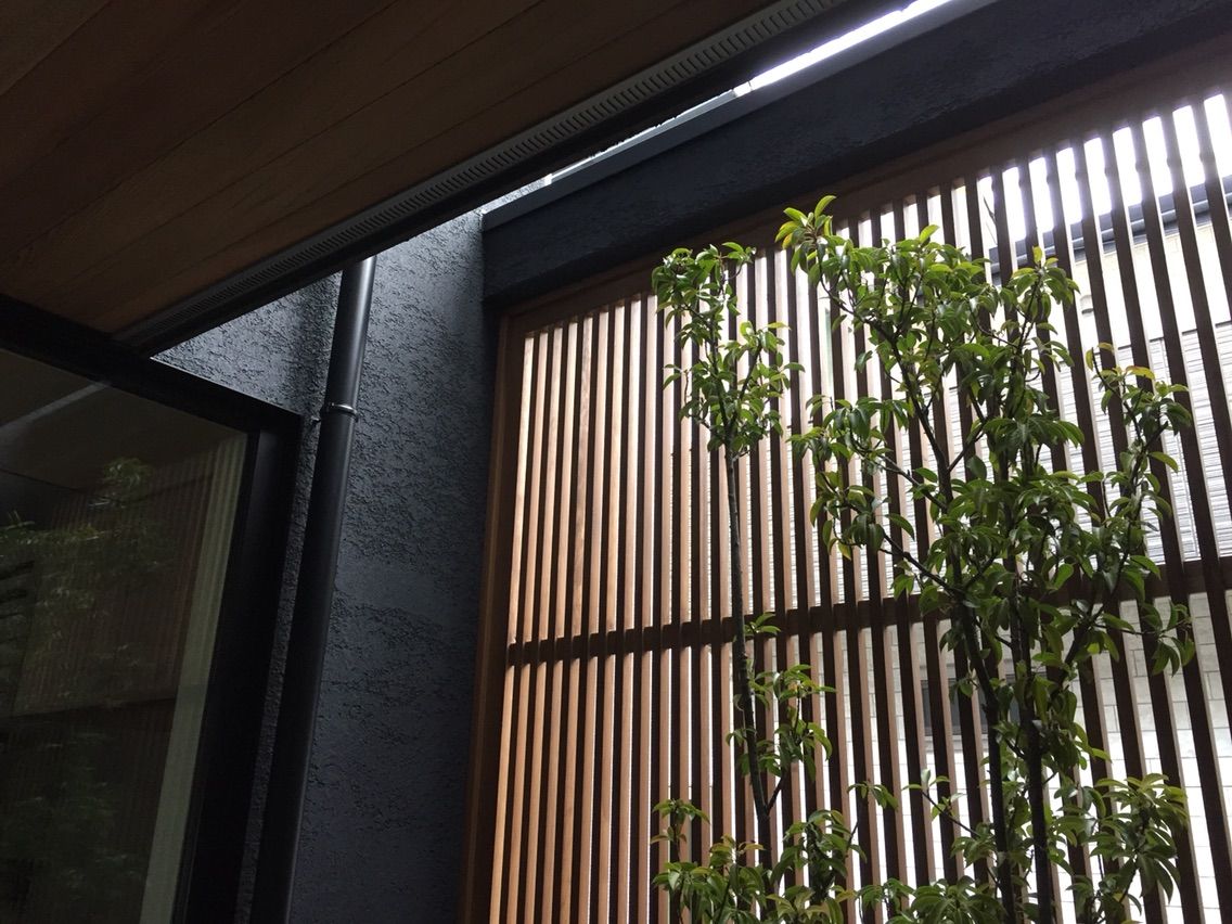 広い空間ではないですが、ソヨゴの株立ちをウッドデッキと黒いジョリパッドの外壁、そして巨大なウッドルーバーフェンスで囲んだ、ジャパニーズモダンな贅沢エリア。